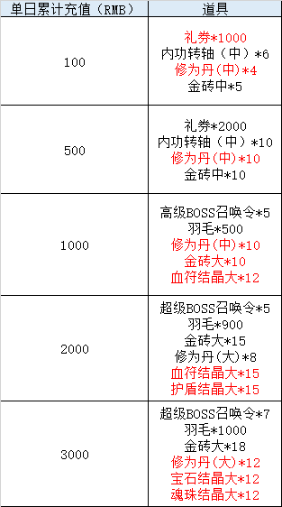 补充说明:单日充值2000元,可一次性领取100、500、1000、2000四个档位的全部奖励。以此类推,充的越多领的越多