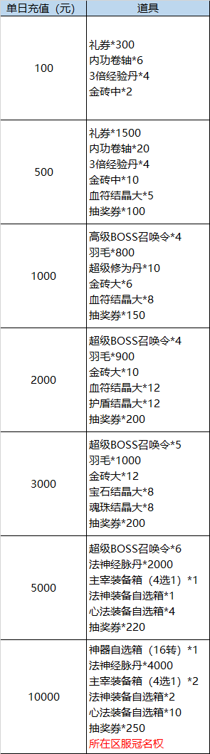 补充说明:单日充值3000元,可一次性领取100、500、1000、2000、3000五个档位的全部奖励。以此类推,充的越多领的越多
